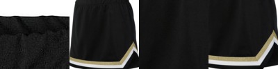 - Left side seam V-notch at hem accented with three-color trim