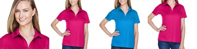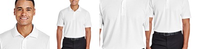 5 oz./yd2 / 172 gsm, 100% polyester face plaited to 60% polyester, 40% cotton back (total overall garment 61% polyester, 39% cotton); Proprietary dual-sided mesh pique knit constructed of fine denier wicking polyester on the outside and soft-as-cotton wicking blend on the inside; Moisture-wicking performance with UV 15-39 protection; Matching flat-knit collar; Luxury, comfort and performance in one; Three-button placket; Dyed-to-match buttons;