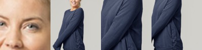 8 oz., stretch & sueded triblend terry; 51% rayon, 43% polyester, 6% elastine; 4-way stretch fabric withstriped loop back yarns; Set-in sleeves; Self fabric collar, waist & cuffs; Side gusset & hand pockets;