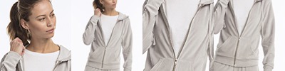 7.6 oz., 80/20 cotton/polyester; Plush velour; White piping detail at sleeve seams; Womens standard fit; Velour drawcord; Made in USA;