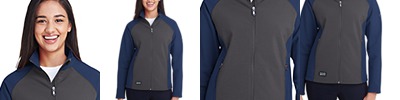 Heavyweight 100% polyester matte brushed tricot ; Ladies' fit ; Heat sealed label ; Center front zipper ; Contrast color inserts on collar and shoulder ; Set-in sleeves ; Front seam pockets ;