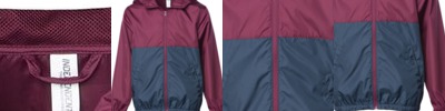 Outer shell of 100% nylon taffeta ; Lined with 100% polyester brushed tricot ; Water-resistant; Woven label; Snap front; Hood with drawcord ; Raglan sleeves for maximum mobility; Front pockets; Elastic cuffs; Open bottom;