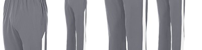 Heavyweight 100% polyester matte brushed tricot ; Heat-seal label; Covered elastic waistband with inside drawcord ; Side seam pockets ; Back yoke ; Contrast color side inserts ; Zipper on outside lower leg ; Matching top style 4387;