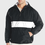 Outer Shell: 100% nylon satin ; Liner: 100% polyester brushed tricot; Water-resistant; Snap front; Raglan sleeves for maximum mobility ; Striped rib-knit collar cuffs and bottom band ; Front pockets; Tear away label;