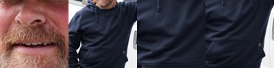 - Contrast-color three-piece hood construction, tacked