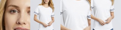 4.5 oz/yd2 / 160 gsm, 100% polyester jersey; Moisture-wicking and antimicrobial properties; ChromaSoft™ technology combines the colorfastness of cationic dyes with soft cotton-feel performance; Tear away label; Fashion forward scoop feminine neckline; Active fit; Easy care;
