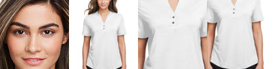 5.3 oz/yd2 / 180 gsm, 69% polyester, 26% lyocell 5% spandex jersey; Moisture-wicking and antimicrobial performance; The fiber lyocell from Lenzing® is a sustainably sourced, renewable and bio-degradable botanic fiber; Henley placket with metal two-snap closure; Side vents; Hi-low hemline; Stretch performance; Active fit; Easy care;