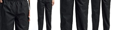 6 oz., 65% polyester, 35% cotton twill; Pull-on chef's trousers ; Elasticated waist with drawstring; Zip fly fastening; Handy pocket on the right leg, left rear patch pocket; Easycare & high temperature wash ;