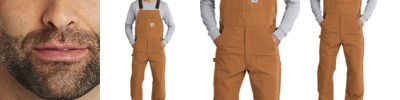 This is an update to our best-selling R01 overalls. 12-ounce, firm hand, 100% ring spun cotton duck canvas Adjustable front-elastic suspenders with highly durable clasps Multi-compartment bib pocket with zippered closure Stretch side panels Zipper fly Two lower-front pockets Ruler pocket on left leg Hammer loop on right leg Updated chap-style double-front construction Double-front knee construction with cleanout bottoms to accommodate knee pads Two reinforced back pockets Reinforced 360-degree kick panels around the cuffs Metal rivets at vital stress points Carhartt-strong, triple-stitched main seams Carhartt label sewn on bib pocket Relaxed fit