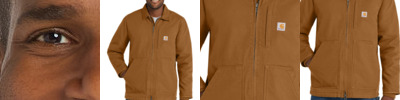 Classic Carhartt style meets Carhartt durability in this coat which features our signature cotton duck fabric for a tough exterior and a soft sherpa lining for warmth and comfort. 12-ounce, 100% ring spun cotton washed duck 100% polyester filling Sherpa-lined body for warmth Quilted-nylon lined sleeves for easy on-and-off Under-collar snaps for optional hood (sold separately) Pleated bi-swing back for additional range of motion Left chest pocket with zipper closure Two interior pockets Two large, sherpa-lined handwarming front pockets Interior rib knit storm cuffs help keep out the cold Carhartt-strong, triple-stitched main seams for added durability Carhartt label sewn on left pocket Carhartt Warmth Rating Earned: Level 2â¿¿Warmer Loose fit