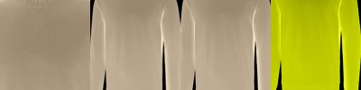 - Iridescent heat transfer O on front left hem