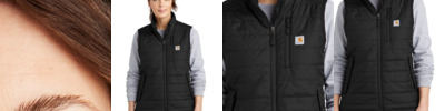 Keep working through cold, wet weather in this women's version of our popular Gilliam Vest. 1.75-ounce, 100% nylon Cordura ® shell Rain Defender ® durable water repellent Wind Fighter ® technology tames wind Nylon lining quilted to 100-gram, 100% polyester insulation for warmth Reverse coil center front zipper Zip-through collar Left chest map pocket with reverse coil zipper Two hand pockets with hidden snap closures Two interior pockets: one zippered, one hook and loop closure Drawcord adjustable drop tail hem Carhartt-strong, triple-stitched main seams Carhartt label sewn on chest pocket Relaxed fit
