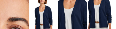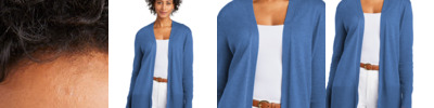 This timeless cardigan features an open front and longer length for easy wear-over-anything style. 70/30 pima cotton/nylon Full-fashioned throughout 1x1 rib neck Wide rib at cuffs and hem