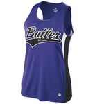 * 84% polyester/16% spandex knit with color secure(r) technology that helps prevent dye migration * 90% polyester/10% spandex wicking mesh back and side inserts with color secure(r) technology * 4-Way stretch properties allow for increased mobility * Wicks moisture * Ladies' fit * Tag-free label * V-neck collar * Racerback styling * Contrast color inserts